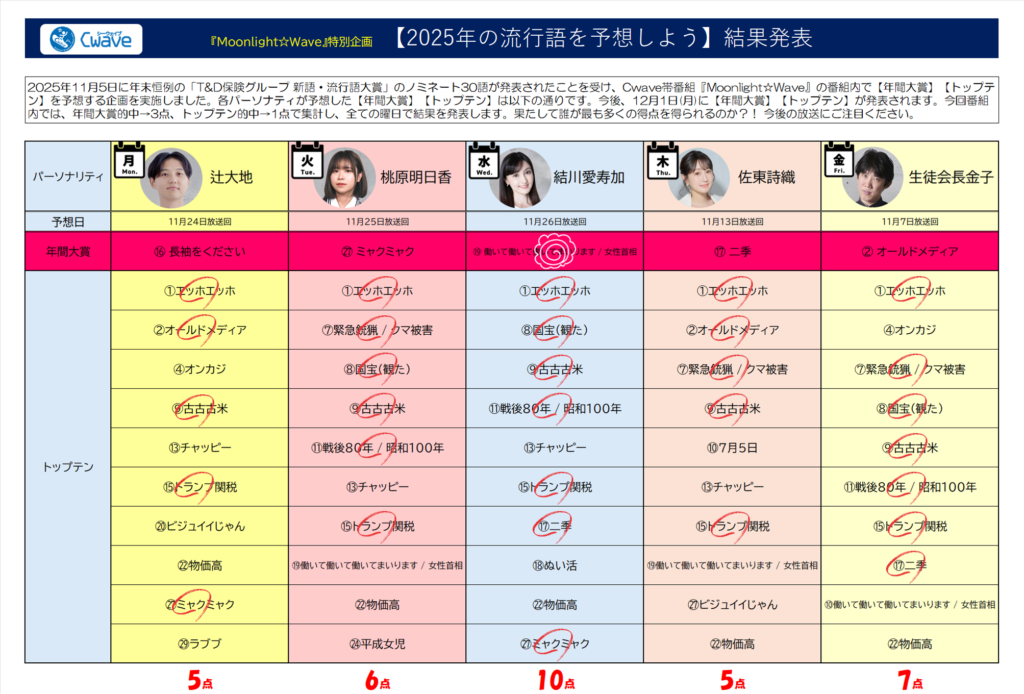 最も多くの得点を獲得したのは、水曜日パーソナティの結川愛寿加さんでした。(計10点…年間大賞+トップテン7語的中)