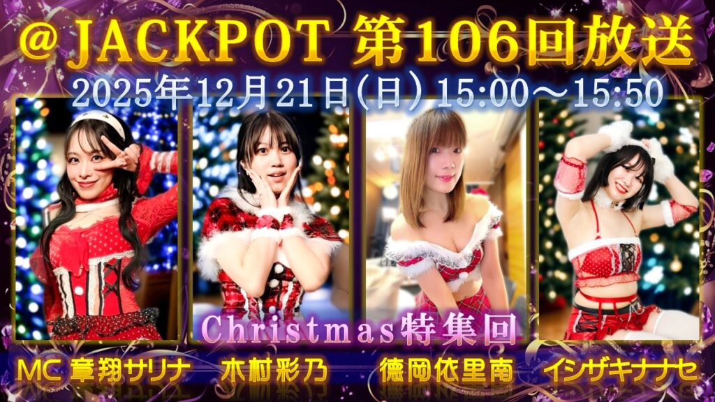 【内容】<第106回放送回>毎年恒例のサンタ祭り回!ダンス&ボーカルユニットお子様ロジックの章翔サリナさん、木村彩乃さん、プロ雀士の德岡依里南さん、女優のイシザキナナセさんでお送りするクリスマスバラエティ回です!クリスマスならではの演目と一年の振り返りをします!MCは章翔サリナさんが務めます!生放送(ミニライブあり)とオフ会(ゲーム大会:放送なし)の2本立て!ゲームオフ会の勝者には囲みチェキ進呈。