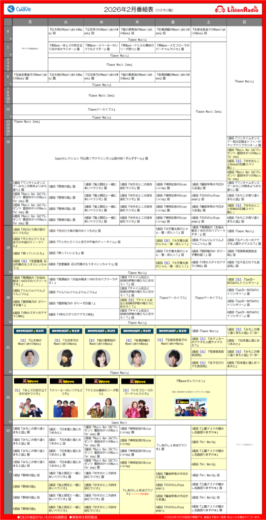 ※リスラジ版の番組表と、YouTube版(CwaveホームページTOP)の番組表は異なりますのでご注意ください。