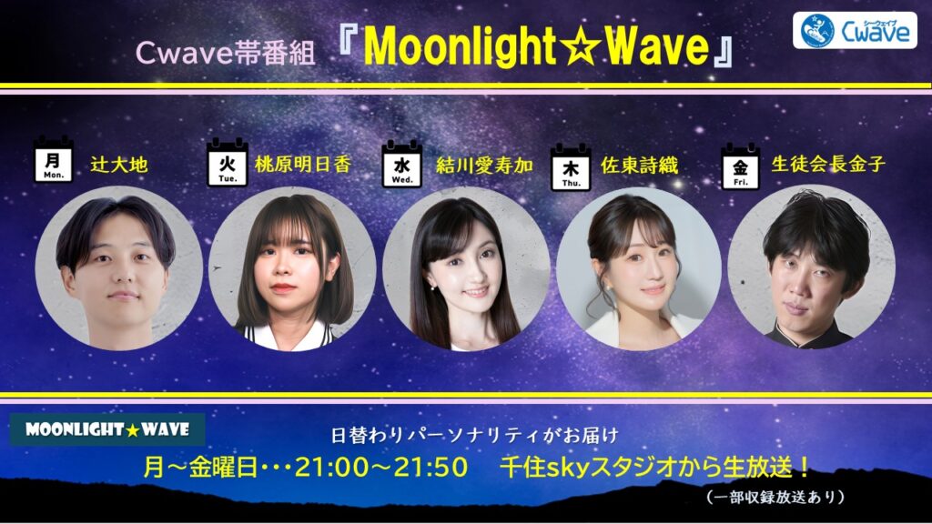 【帯番組】 『Moonlight☆Wave』21:00~21:50 『笑wave』22:00~22:50 【月曜日】 『恋愛番長 石川円華のもうすぐいっちゃう♡~Dreams come will soon true!~』 『阿部宣祐のスポーツとらのアナ』 『野球の路』 【火曜日】 『朝風心愛の愛のダダ漏れ』 『夢色ロケット』 『平成浪漫企画アワー』 『アリサと翔のラブ♥ドッキュン』 『チャレンジ!!これから何する!?』 『嶺上開花と一緒にあいべラジオ』 【水曜日】 『千とせとさくらと京子の午後のティータイム』 『りんりんTV 倫理人図鑑』 『内川ひろ美の歌のおくりもの』 『飛澤結の「お悩み解決!ゆの子のバブリーラヂオ」』 『Nao+出没注意!!』 『下町シネマ🎬ティーアップ⛳』 『KSJ発!ザクマシンガン山田のOh!ずんずずーん!!』 『ゆきおとこが詩を詠むラジオ』 【木曜日】 『澤村壱番の人生PocaCosa』 『唄っていいとも』 『猪狩璃乃の がりーず夢計画!』 『スレパンふくみの音と生きやがれ』 『チャイム松丘とBOOMER伊勢の俺たちに任せろ!?』 『西口ドアの扉電信』 『神咲妃奈のEnjoy Living』 【金曜日】 『大平憲太郎・辻朱弥のじゃん!憲!ぽんっ!』 『のののんのsea angel』 『藤田早希の今日から友達』 【土曜日】 『天翔ゆいの自信を持ってさあぞうぞ!』 『元アンカーのアナタも人間ヤメマスカ?』 『北千住だれでも放送局』 『ポMカズダイのアゲラジMAX』 『声優プラネタリウム』 『怪探倶楽部』 『りんりんりりん♪りんごりん』 『Ari World』 【日曜日】 『Sun20~RAYSAのヒトリシキリ~』 『日曜日の魔女達』 『TWILIGHT☆BREEZE』 『ゆきおとこの流山だョ! 全員集合』 『@Jackpot』 【不定期番組】 『ワンタイムオンエア』 『Cwaveかるたバトル』 『北千住の達人&木曽さんちゅうの集え!千住民』 『レッスン祐輝の鉄道wave』 『山根千佳の相撲三昧』 『チョコミント仮面。のチョコミン党拡大計画』 『YOKOHAMA DAYS』 『HiiT Wave』