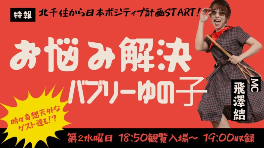 ミュージカル役者・飛澤結(とびさわ ゆの)が、黒電話の前で視聴者のお悩み相談に答え、歌とダンスで彩る「バブリー」な昭和テイストバラエティ番組